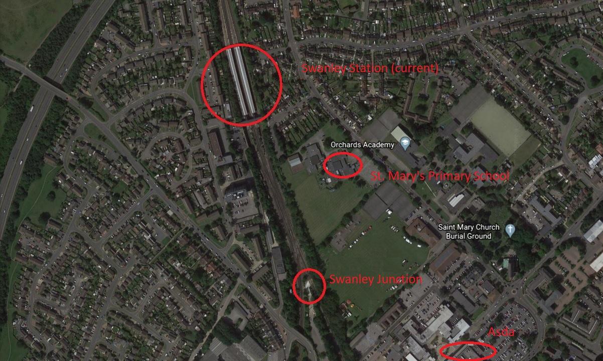 Swanley Junction- In July 1862 a new station was created (east of St Mary Cray) to avoid timetable congestion for trains going down to Sevenoaks. The station was originally called Sevenoaks Junction, due to it being placed where the lines down to Faversham split from the lines down to Sevenoaks. The name Sevenoaks Junction caused confusion to new passengers to the area who got off the train here and expected to be in Sevenoaks! Due to the growing area around 'Sevenoaks Junction', the station was eventually given a name to recognise the growing town, and Swanley Junction was born.